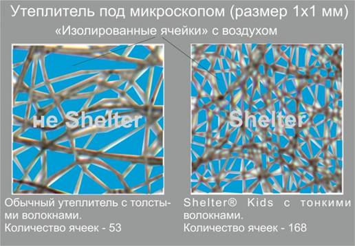 Главным преимуществом утеплителя для детской одежды из микроволокон Shelter Kids® является большее количество «изолированных ячеек» с воздухом на единицу объема по сравнению с материалами из обычных волокон. Ячейки удерживают воздух и препятствуют активному теплообмену. Поэтому Shelter Kids обладает большим тепловым сопротивлением, чем обычные утеплители.